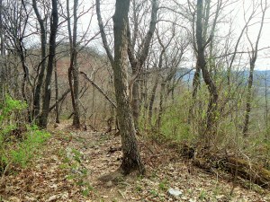 I stopped at a campsite about half way up to give Sidekick Pauli some water and take a break. Gosh, the woods were beautiful this morning. Spring had made its way to the mountain with the underbrush greening up, the birds chattering and a nice breeze singing through the branches above me. What a lovely place, even with the rocks!